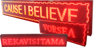Menyediakan Moving Sign Atau Running Text. Moving Sign ini adalah modul LED dengan ukuran yang bisa dikostumisasi. Tersedia dalam warna merah dan juga RGB. Moving sign ini biasanya digunakan sebagai ucapan penyambut ( greeting ) dalam instansi / perkantoran. Bisa juga digunakan sebagai media promosi pada minimarket / supermarket. Tersedia dalam berbagai ukuran sesuai dengan ukuran ruang, dengan rincian :